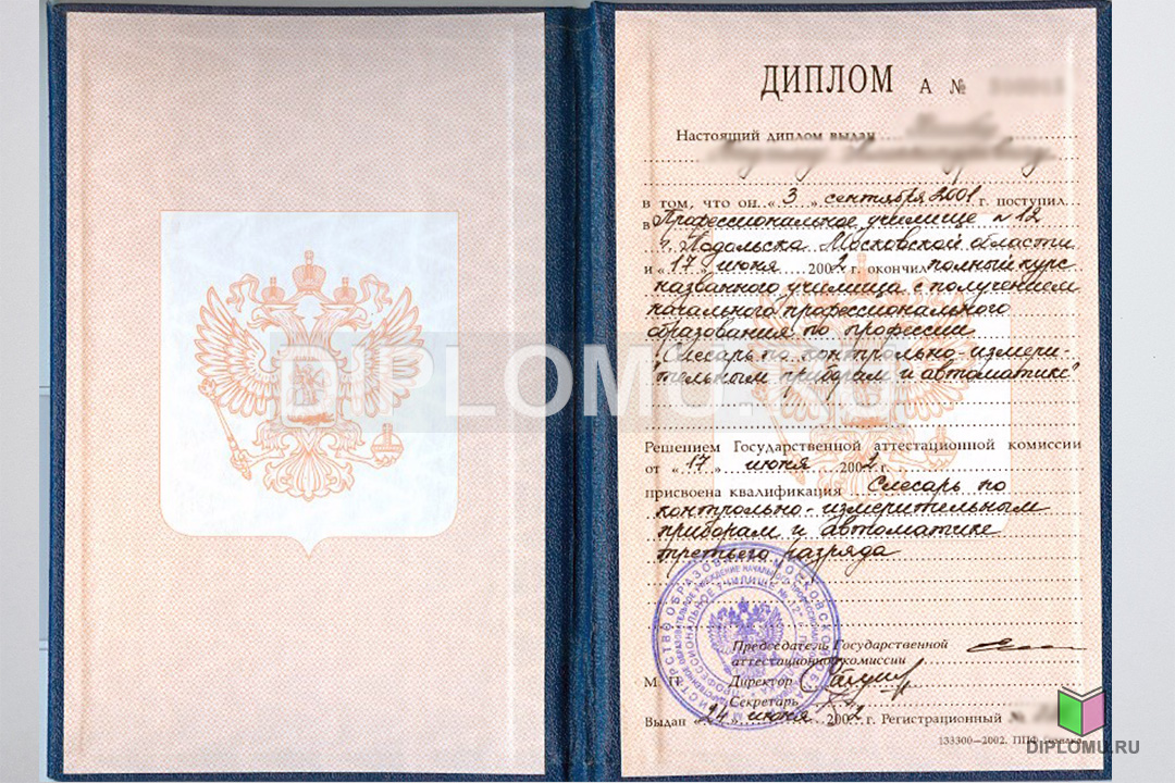 На нашем сайте Вы можете купить диплом о начальном образовании с окончанием ПТУ или ПТЛ в 1995, 1996, 1997, 1998, 1999, 2000, 2001, 2002, 2003, 2004, 2005, 2006 годах. В данном разделе представлены образцы и фото диплома, ознакомиться подробнее с которыми можно, кликнув по картинкам ниже. Наши специалисты заполнят диплом по всем правилам, установленным Министерством образования и науки РФ. Заверяется «мокрыми» печатями и нужными подписями.